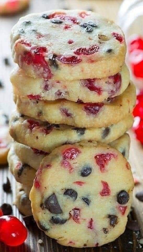CHRISTMAS-MARASCHINO-SHORTBREAD Ingredients °1 cup unsalted butter – room temperature °1/2 cup powdered sugar °1/2 tablespoon vanilla extract °2 cups all-purpose flour °1/2 tsp salt °3/4 cup chopped maraschino cherries (spread cherries on paper towels to drain well or use dried maraschino cherries) °2/3 cup chocolate chips Preparation